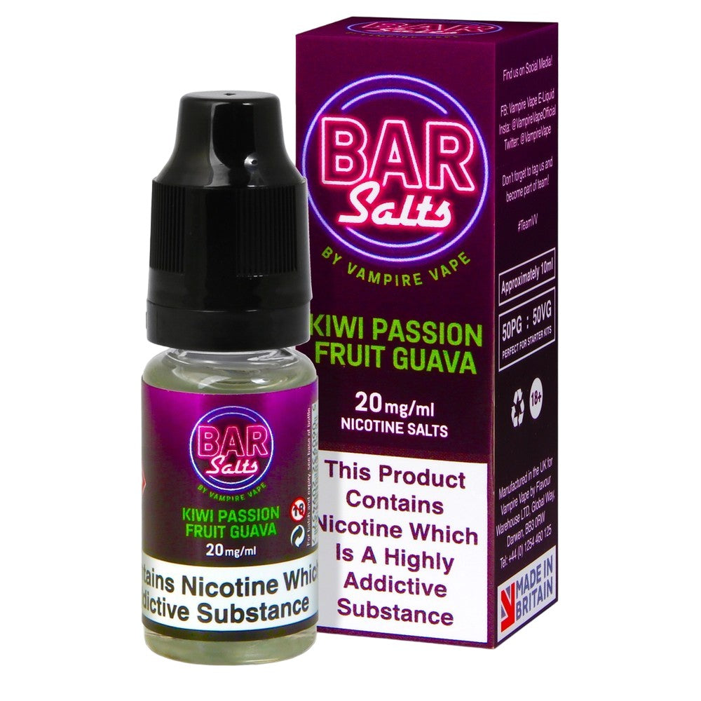 Elevate your vaping experience with Bar Salts - Kiwi Passion Fruit Guava Nic Salt E-liquid 10ml - 20mg, a tantalizing blend of popular tropical fruits expertly crafted by Vampire Vape Bar Salts.