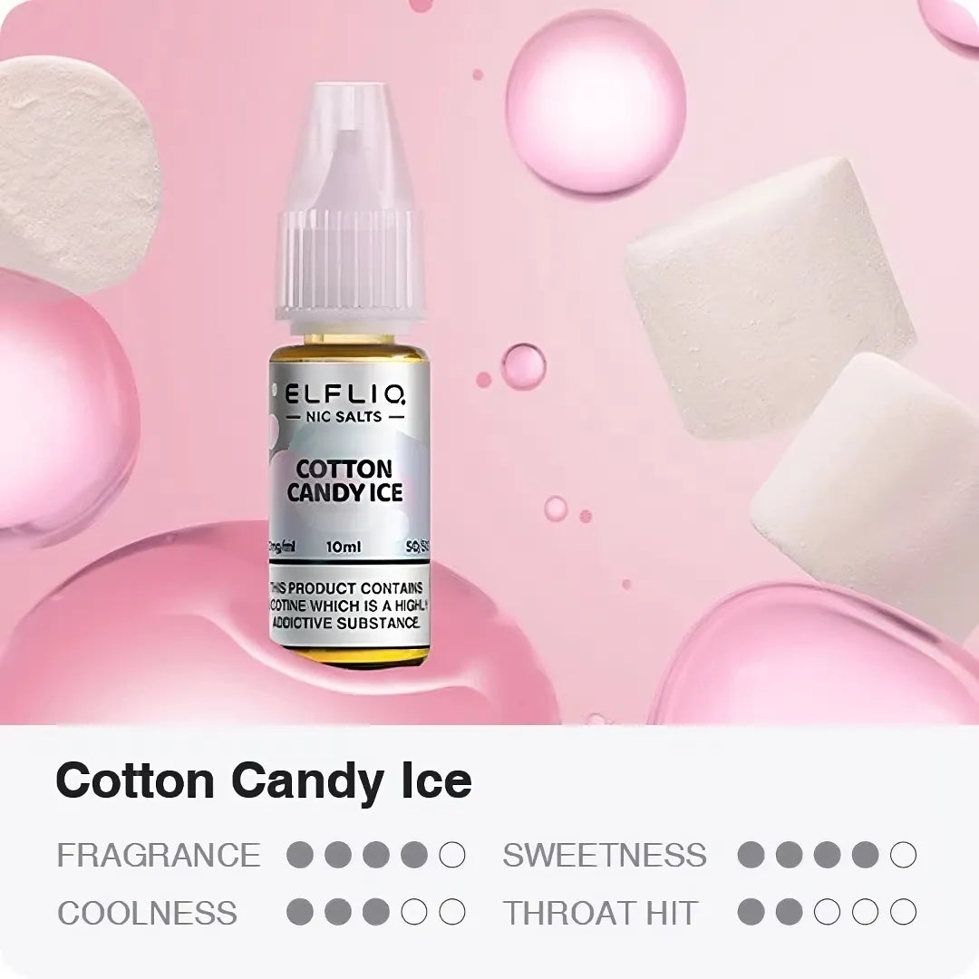 The ElfLiq Cotton Candy Ice 10ml nic salt e-liquid is part of the ElfBar 10ml e-liquid collection, also featured in ElfBar disposables. It's available in 10mg or 20mg nic salts.